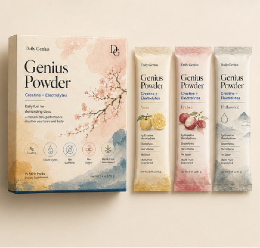 Genius Powder is daily creatine + electrolytes in flavors like Yuzu and Lychee — made for people who want the benefits of creatine without the gym-bro flavor wheel.