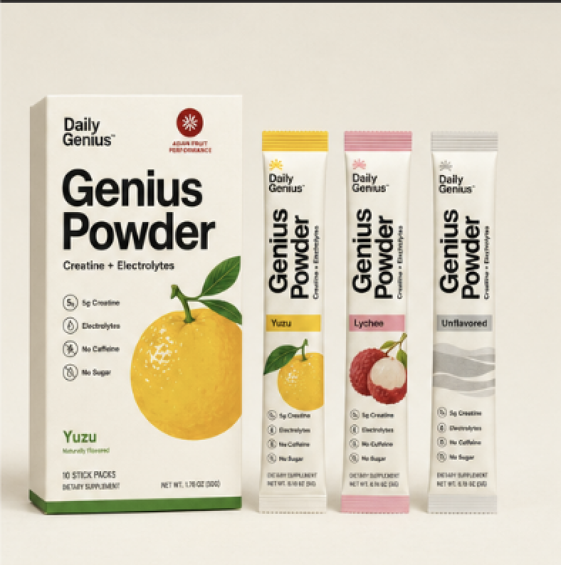 Genius Powder is a creatine + electrolyte stick pack designed to support body-and-mind performance — with 5g creatine monohydrate, daily electrolytes, and clean flavors like Yuzu and Lychee.